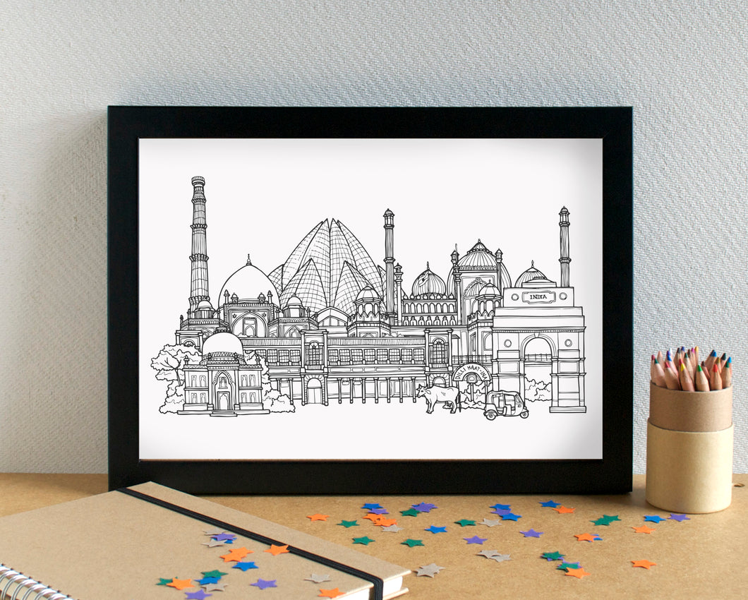 A stunning art print of my line drawn skyline illustration of the most famous landmarks in magical Delhi.