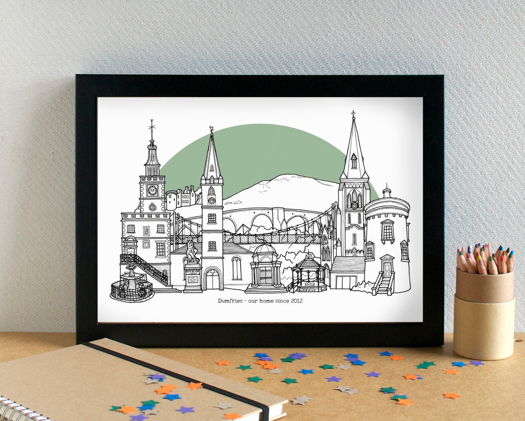 Dumfries Skyline Landmarks Art Print - can be personalised - unframed