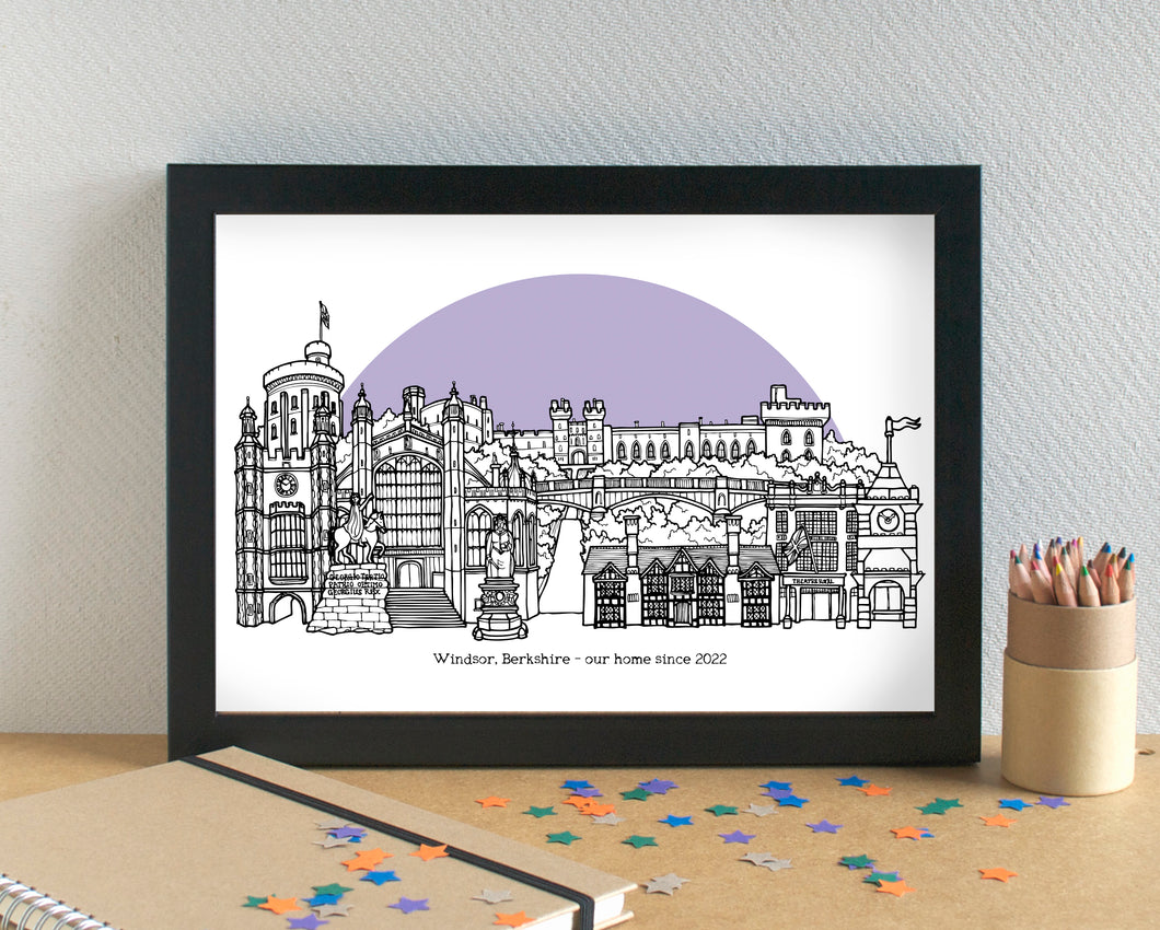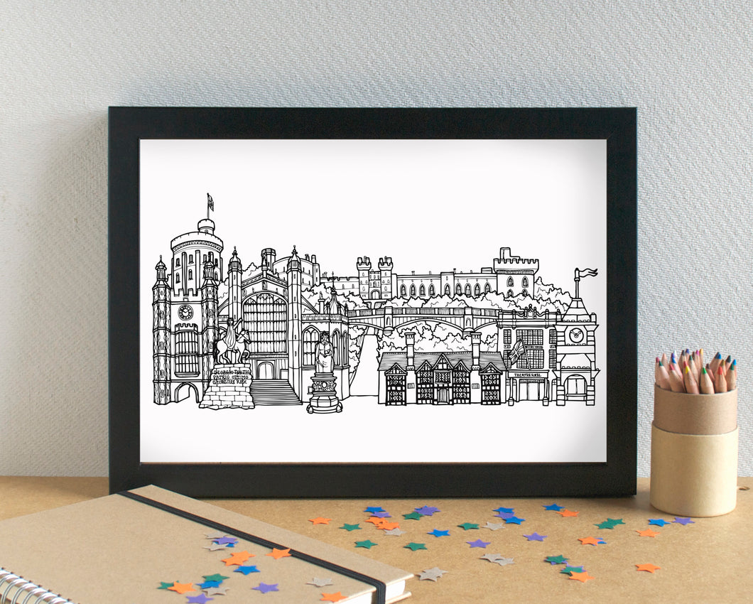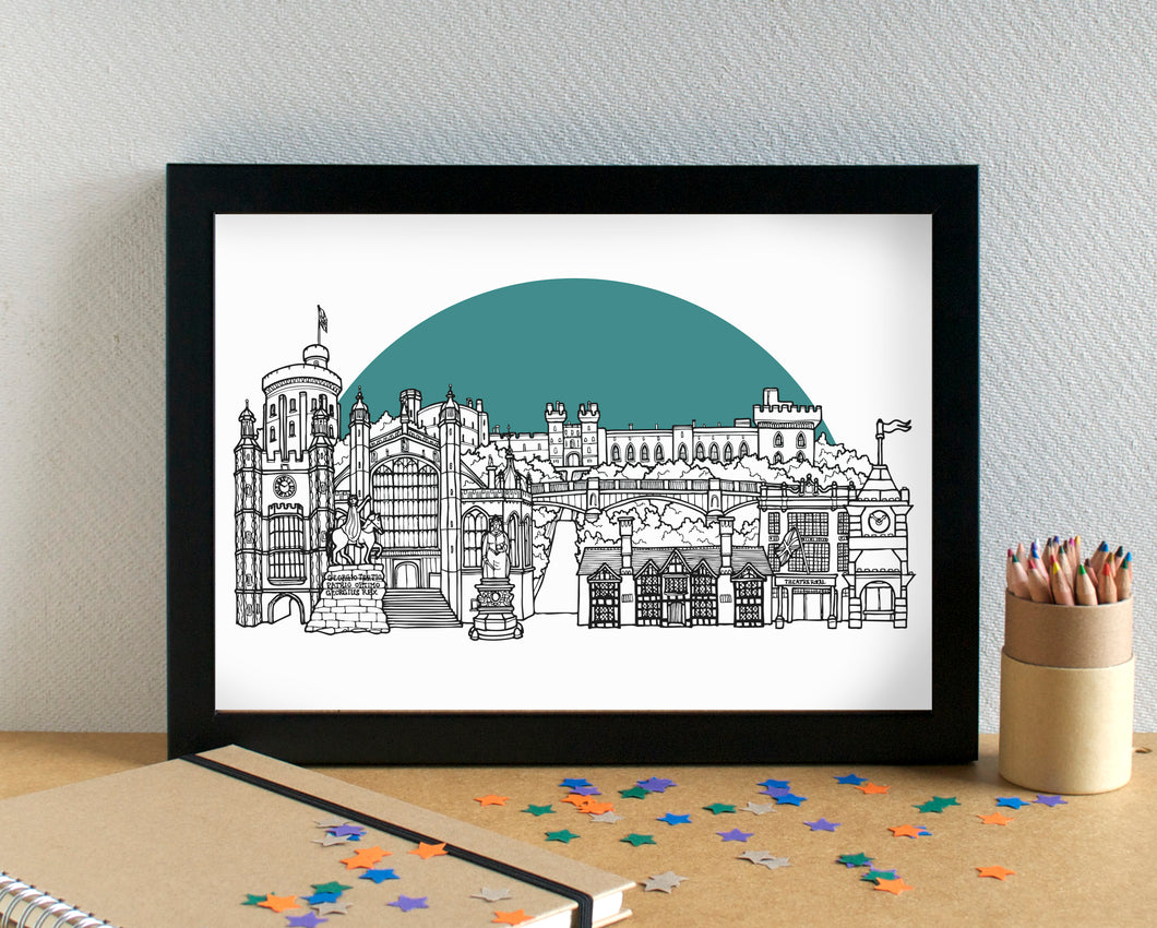 A stunning print of my pretty skyline illustration of the most famous landmarks in Windsor, Berkshire - the second home of the Royal Family.
