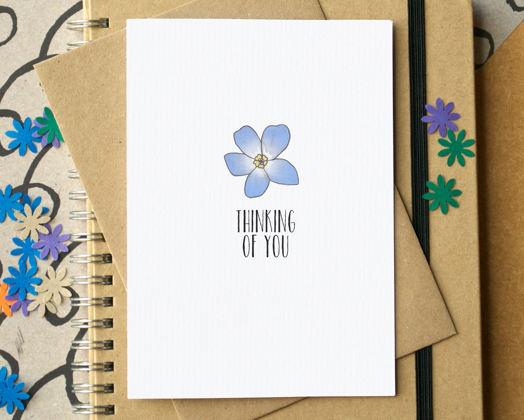 A simple sympathy card with a pretty watercolour forget-me-not flower, and the words "thinking of you".